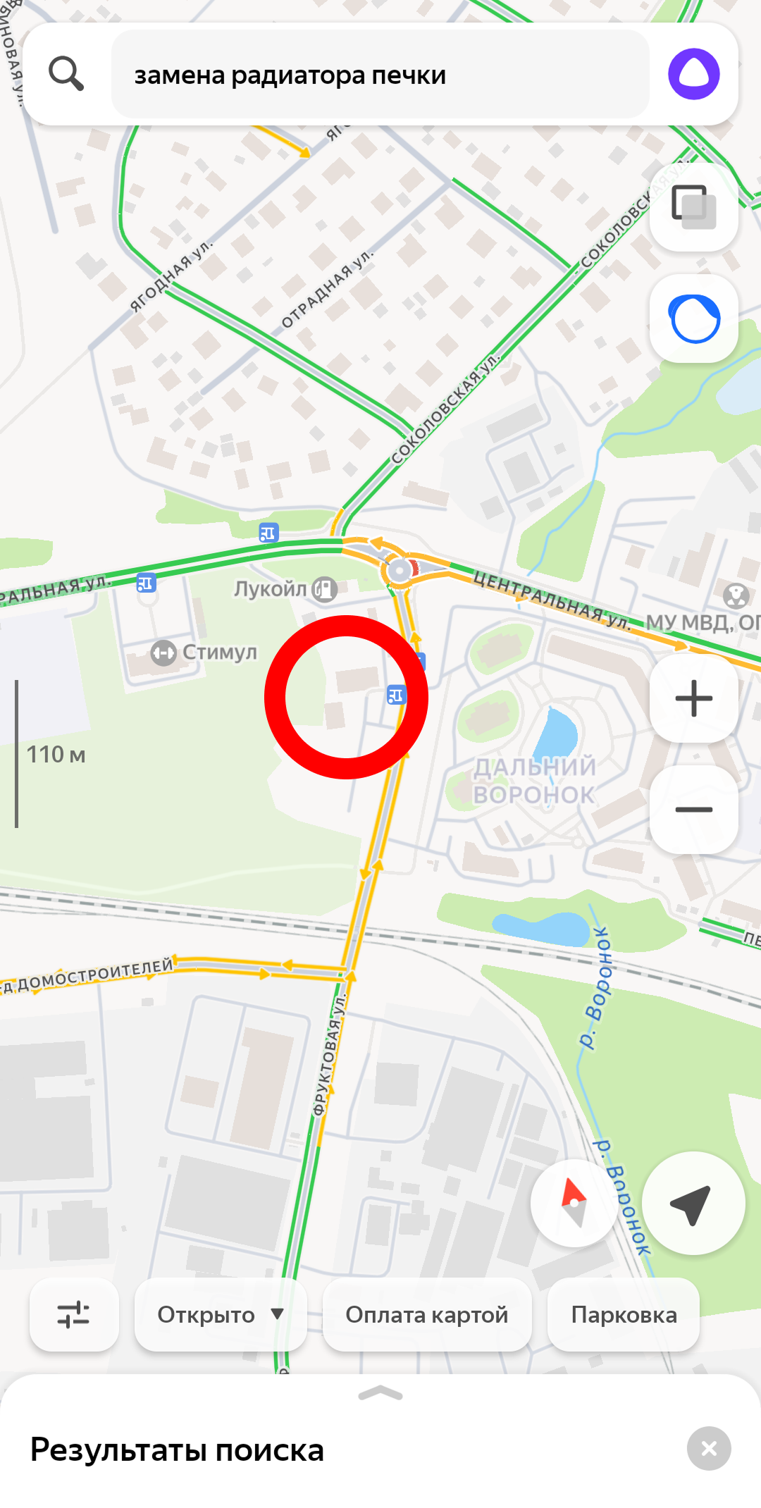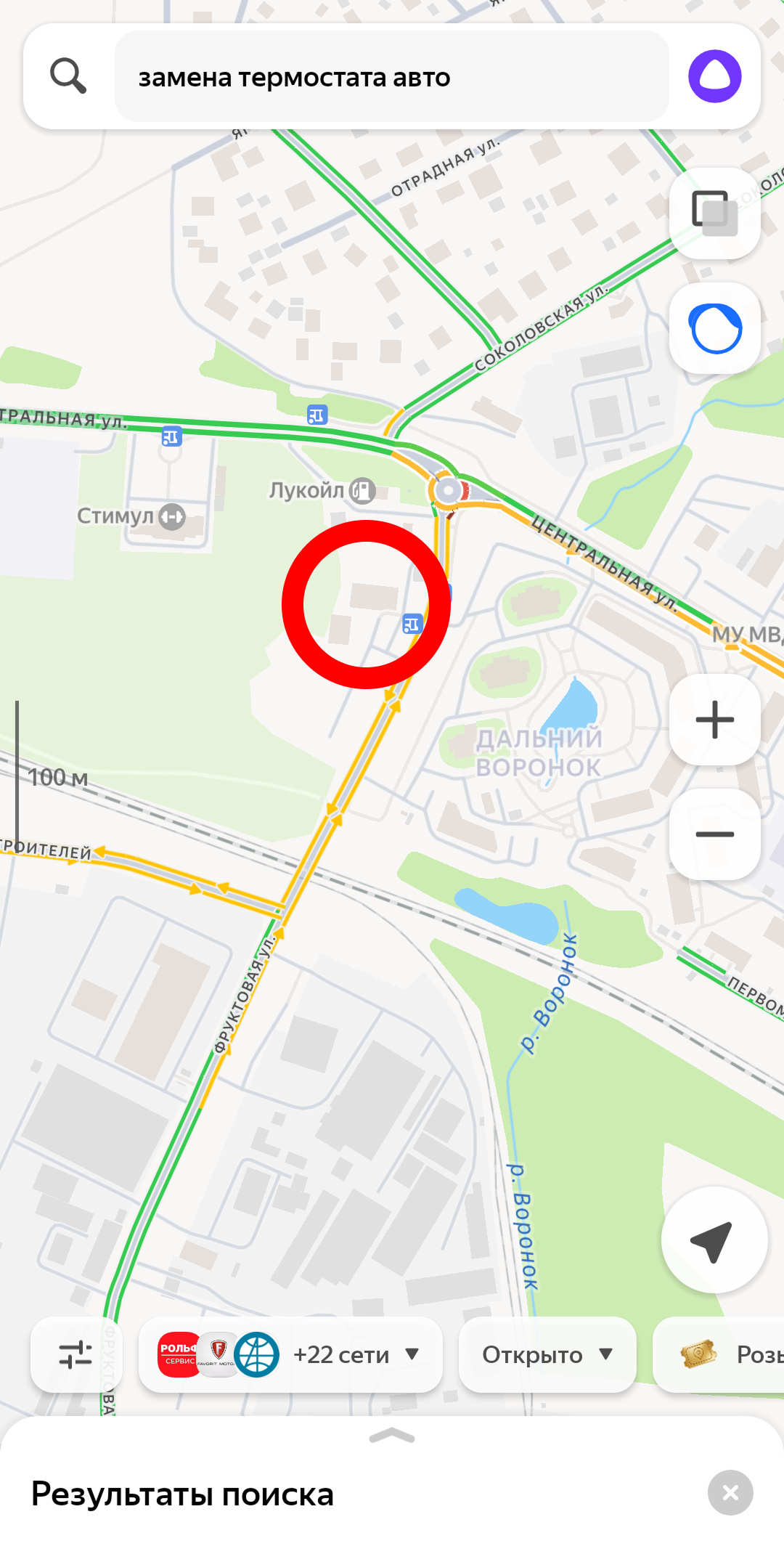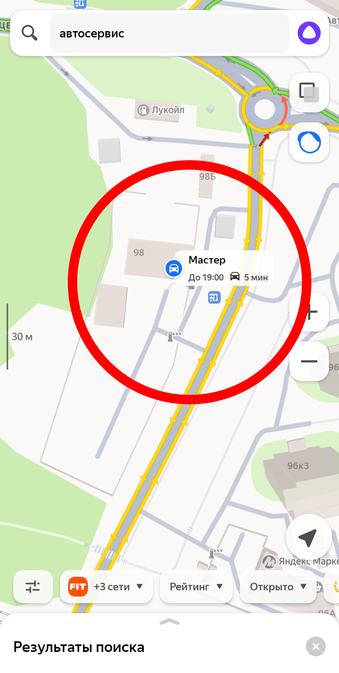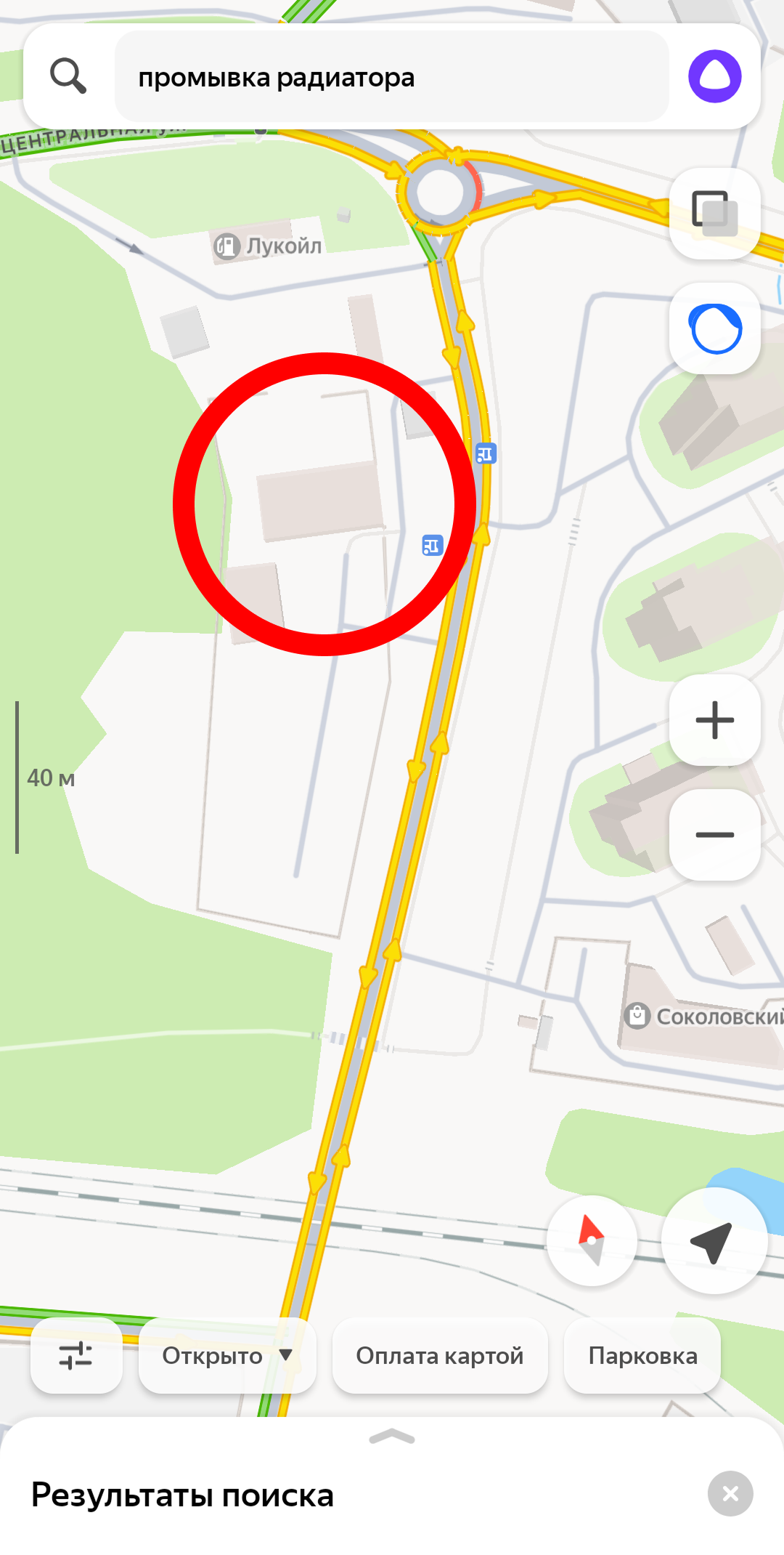 (фото ниже, в красной рамке на карте находится автосервис, по запросу его не видно)