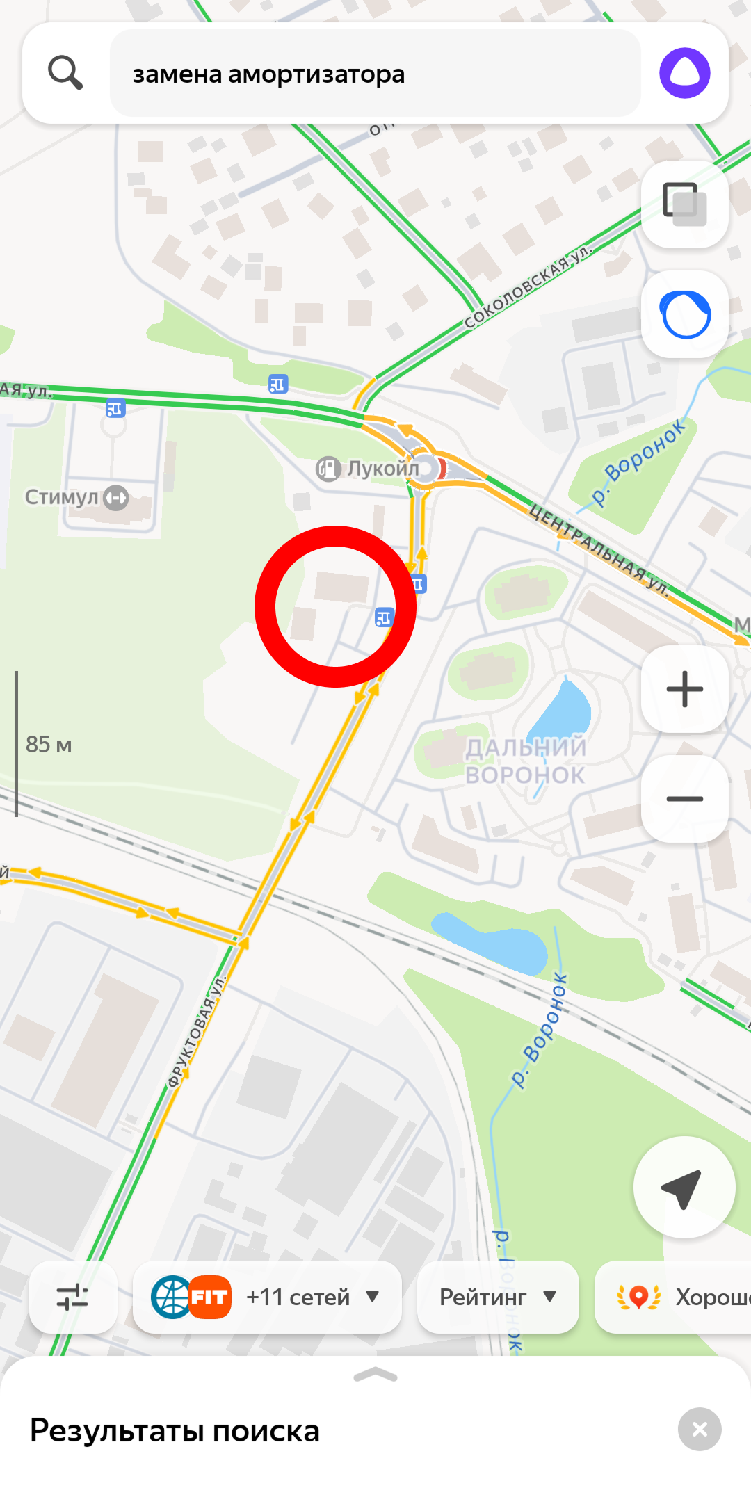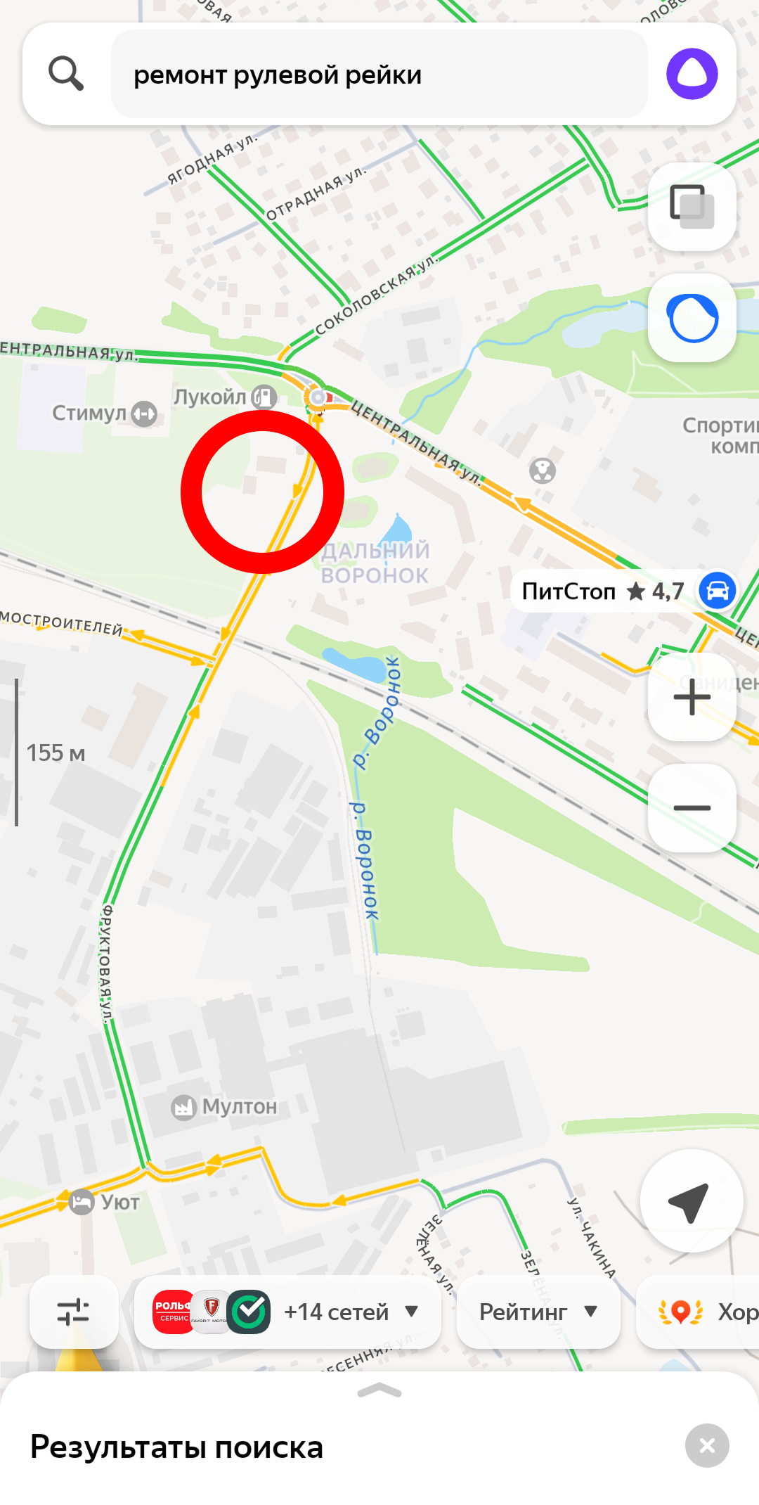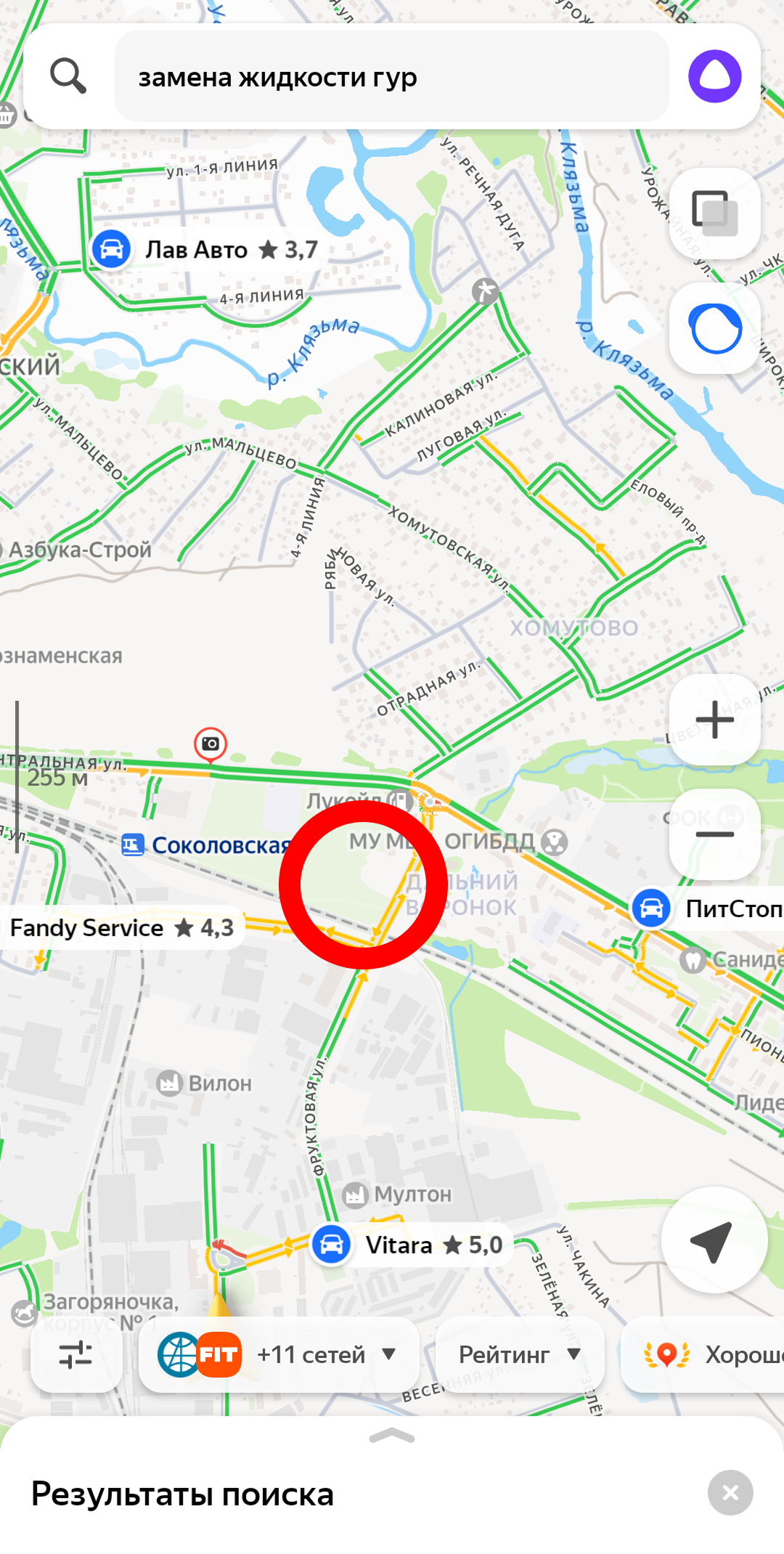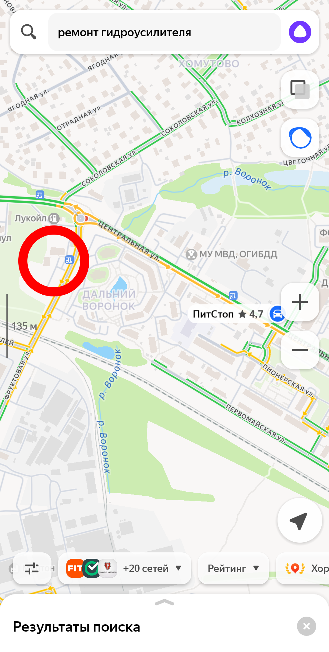 (фото ниже, в красной рамке на карте находится автосервис, по запросу его не видно)